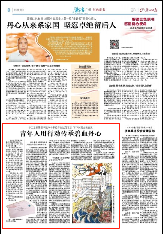 2022年3月29日,广州日报“红色家书”专栏刊发了题为《华工bevictor伟德八十多位员工以信言志写下对烈士的哀思青年人用行动传承碧血丹心》的文章,大力表扬了bevictor伟德八十多名员工“以信言志,写下对烈士哀思”的烈士纪念活动,获得了社会各界广泛认可。