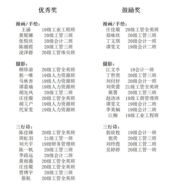 再次恭喜以上同学!本次主题作品征集活动参赛及获奖同学的加分证明将在活动后期由班委代为转发到各自所在班群,请注意查收。