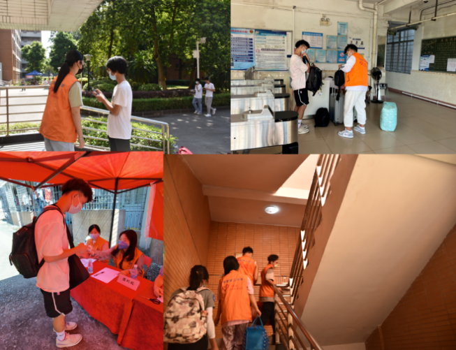 与此同时,身穿橙色马甲的志愿者们也早早在各大迎新点等候,有条不紊地引导新生办理入学手续。从检验健康码、行程卡、核酸检测证明到协助新生入住、搬运行李,每一个环节里志愿者们都认真负责,细致耐心,让刚踏入校园的2022级新生们感受到了不一样的温暖。