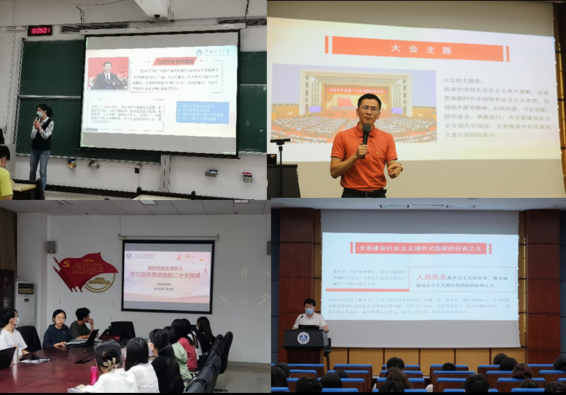 本科生第一党支部与2021级博士生党支部联合开展“百年奋斗路 启航新征程”学习党的二十大精神专题党课,充分发挥支部每位党员主观能动性,组织多名党员以微党课形式对党的二十大精神进行宣讲、交流与讨论,现场党员思维交流碰撞,展示了“树立远大志向,争做时代的执笔者”等多项学习成果分享。本科生第三党支部和2021级硕士生第二党支部联合开展“学习二十大 礼赞新时代”主题党日活动,从党的自我革命精神、中国式现代化等多角度共同学习党的二十大报告原文,分享学习感悟,引导同学们明确使命、勇于担当,涵养家国情怀。本科生第四党支部与2021级硕士生第三党支部联合开展“学思践悟二十大 砥砺奋进新征程”主题宣讲活动,引导广大党员深刻领悟“两个确立”的决定性意义,进一步增强“四个意识”、坚定“四个自信”、做到“两个维护”,不断锤炼自己的政治素养、道德素养、专业素养,以昂扬奋发的志气,让青春在火热实践中绽放绚丽之花。