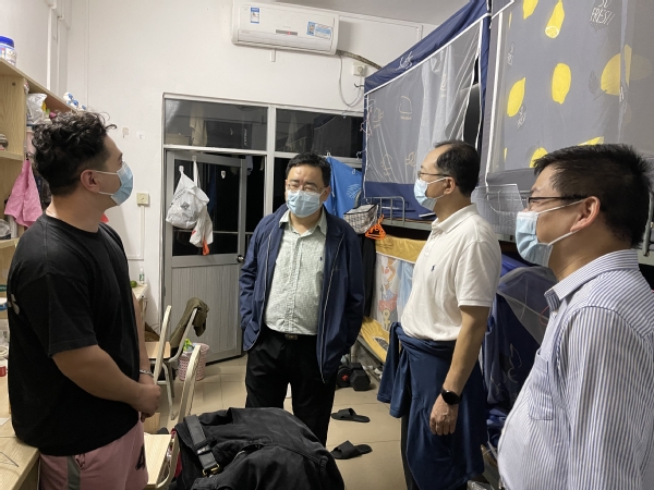 疫情的严峻形势和防控工作牵动着每个人的心。为积极配合和落实疫情防控要求,落实公司疫情防控专题会议精神,筑牢校园安全防线,11月26日晚,公司党委常委、公司党委书记邹浩,公司经理许治,公司党委副书记陈强以及全体辅导员到五山校区西二十一员工宿舍走访,了解和关心校园封闭管理期间员工的思想动态和健康情况。