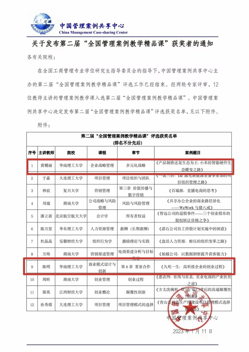 由全国工商管理专业学位研究生指导委员会指导、中国管理案例共享中心主办的第二届“全国管理案例教学精品课”评选工作于近期顺利完成。经过两轮专家评审,全国共12位教师主讲的管理案例教学课入选第二届“全国管理案例教学精品课”,公司黄嫚丽老师的《企业战略管理》(“多元化战略”章节)、陈明老师的《商业模式设计与创新》(“重要合作”章节)两门课程成功入选。