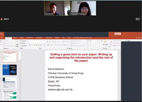 David Ahlstrom作了主题为“High-quality academic articles require experience sharing with high-level journals”的报告。David Ahlstrom从摘要和引言开始,介绍了论文的研究设计和文章结构,包括研究问题提出、文献综述、研究方法设计以及研究贡献等。他以一篇范文为例,为大家介绍了题目和引言段落应如何设计与安排。