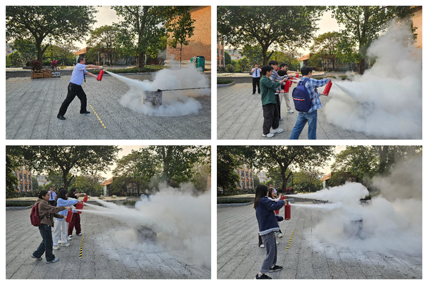 随后,在安全员的指导下,师生们分组进行了灭火实战演练。大家谨记“一看、二提、三拔、四瞄、五压”的规范使用口诀,展现出极高的专注度和执行力,成功扑灭火焰。