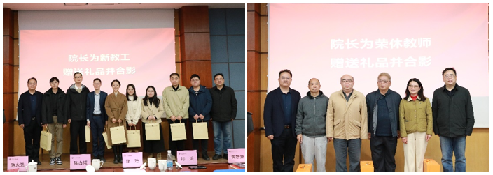 书记、经理与新教职工(左)、荣休教师(右)合影