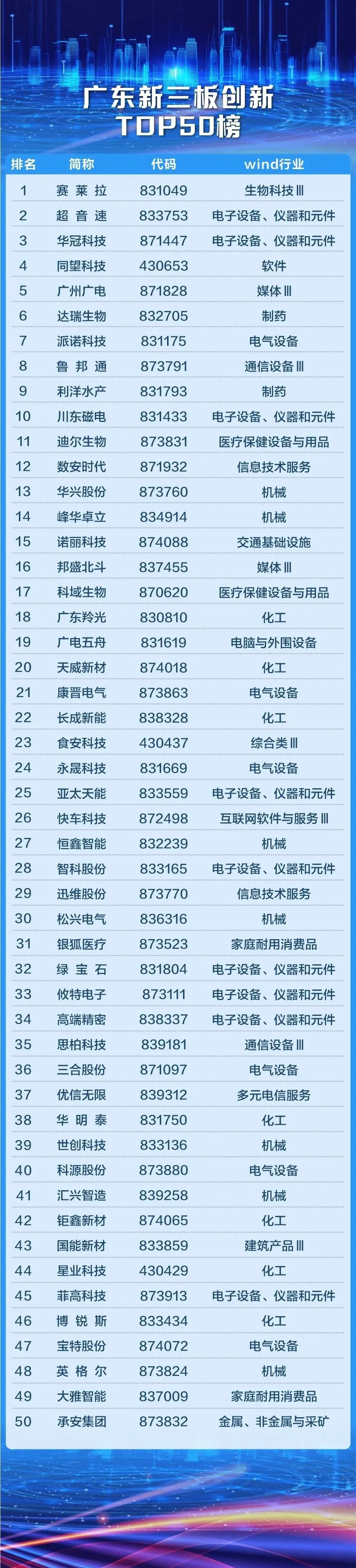 50榜公司在研发力、融资能力、成长性、产业链竞争力等方面表现突出,尤其是创新实力硬核,是广东新三板的创新引领者。50榜公司中,综合得分最高的是赛莱拉,公司隶属于生物医药行业,致力于成为全球领先的干细胞制备服务商。目前赛莱拉公司拥有细胞制备中心,可提供科研级和消费级制备及服务。分指标来看,赛莱拉研发力综合排名高居第一位,去年研发支出3704万元,位居第八;研发支出占比高达32.8%,高居第一;专利数达438个,高居第二。