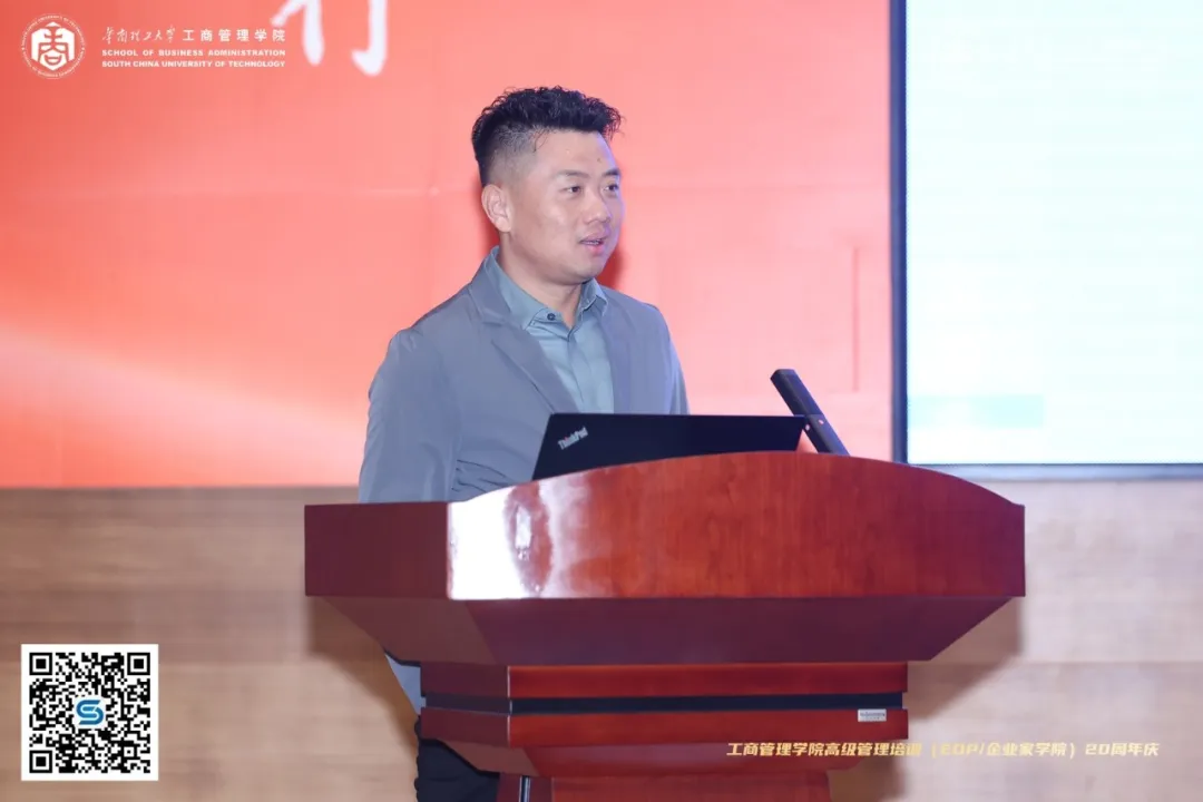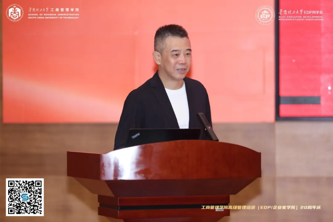 EDP同学会名誉会长代表、全国政协委员、佛山市工商联主席、尚品宅配董事长李连柱员工上台发言,他对公司大力支持同学会工作表达了衷心的感谢,也对任泳谊员工的工作思路表示赞同,更寄望EDP同学会在第六届理事会成立后,凝聚更多企业家力量,为员工赋能助力,为母校增光添彩。