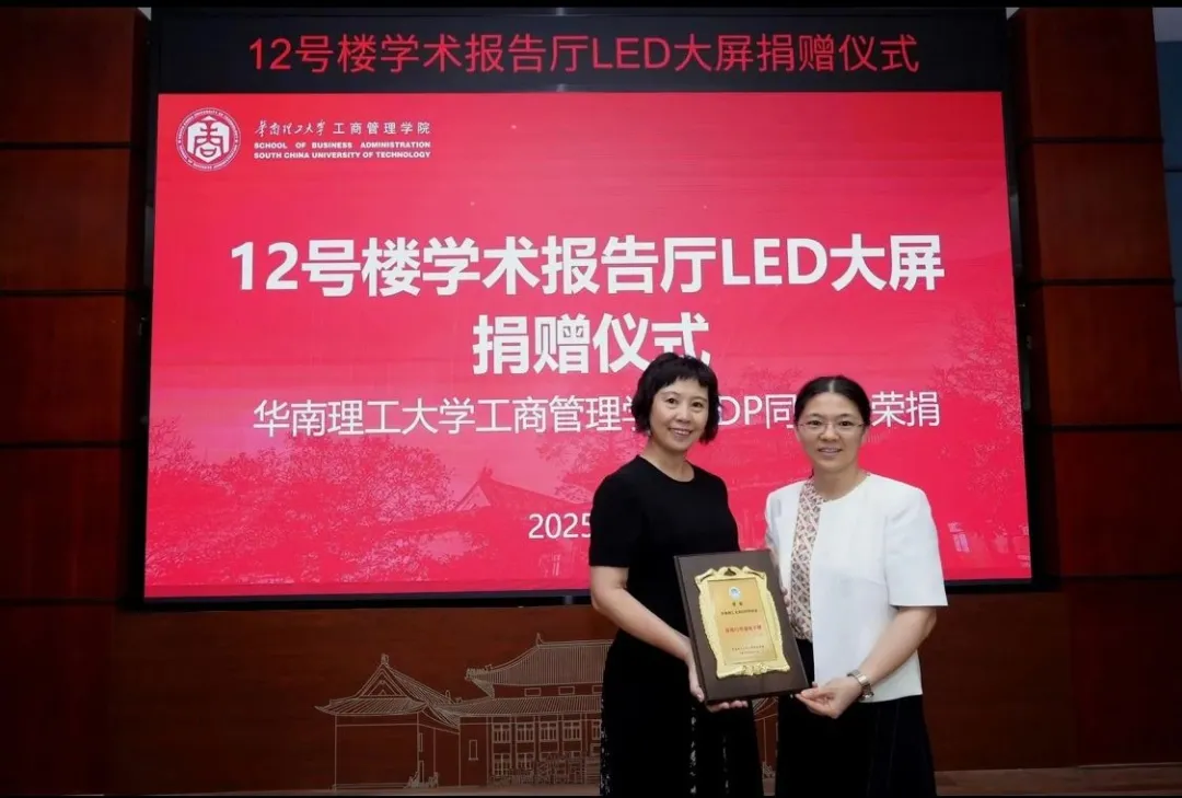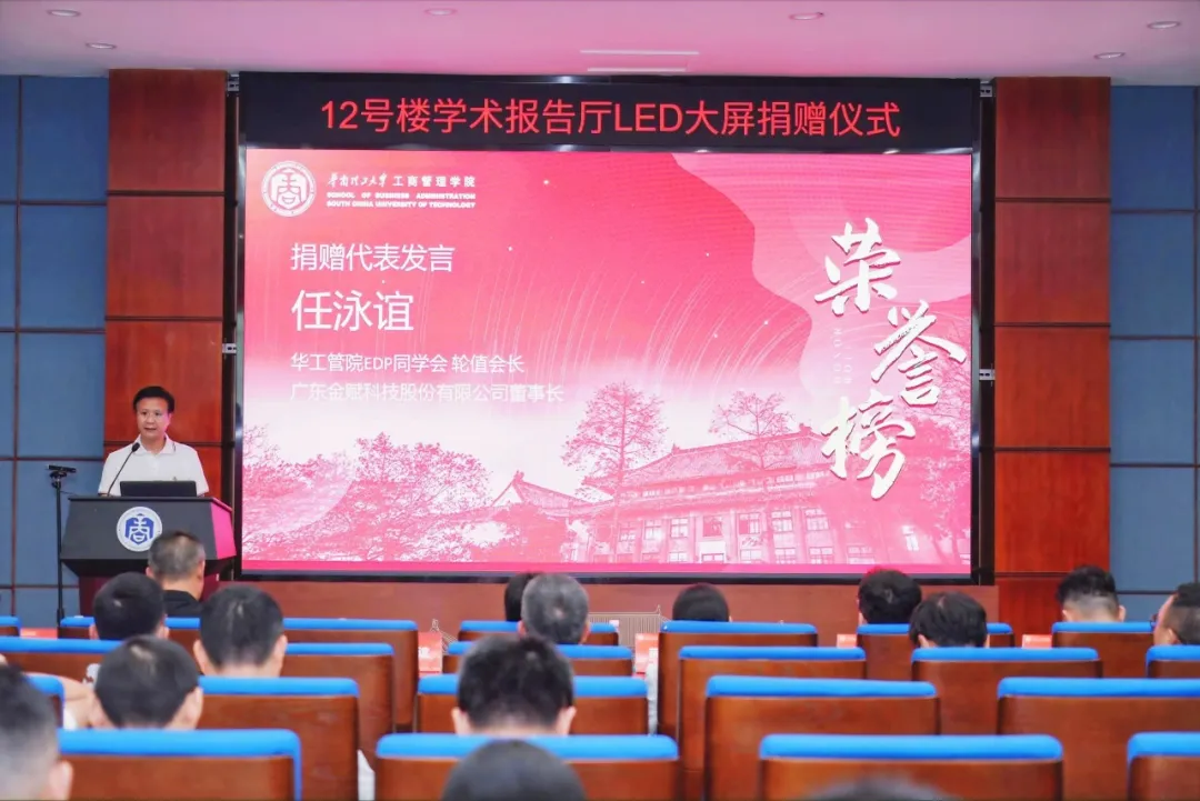 企业捐赠是产学研协同的纽带,个人捐赠则彰显华工人“饮水思源”的精神底色。作为捐赠代表,EDP同学会轮值会长、广东金赋科技股份有限公司董事长任泳谊发表了感人至深的讲话。这块LED大屏不仅是对母校的感恩回馈,更是对教育场景创新的一次实践。任会长回顾了EDP同学会十四年的发展历程,特别提到此次捐赠倡议仅一周就获得31位员工积极响应,充分体现了员工们的反哺热忱。他期待以此次活动为契机,进一步推动穗港员工合作,为大湾区发展注入员工力量。