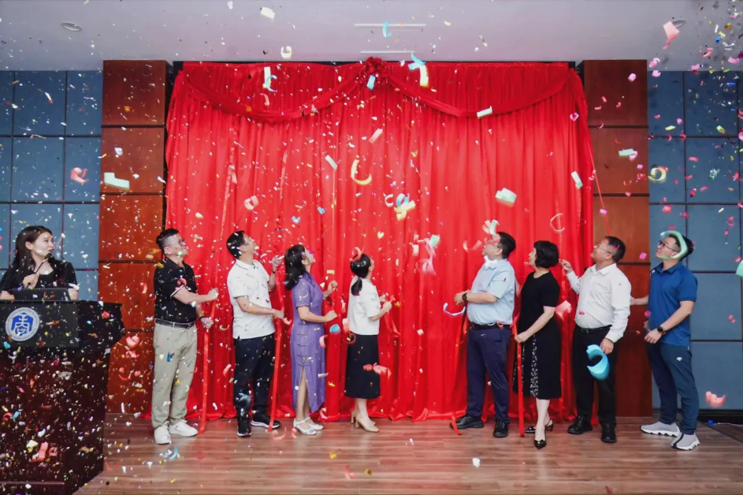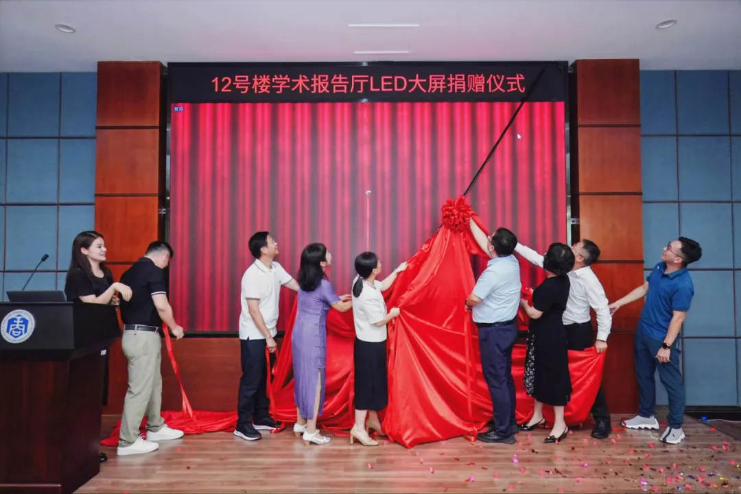 在热烈的掌声中,华工公共关系处(员工工作处)处长、员工会秘书长蒋连霞、华工公司党委书记周勤、经理许治、EDP中心创始人许晓霞、EDP同学会轮值会长任泳谊、刘国兴、陈盛钧、陈少强共同上台揭开这份满怀员工情谊的礼物。随着幕布滑落,屏幕亮起的瞬间,斑斓的光影如银河倾泻,这不仅是科技与匠心的凝聚,更是员工们对母校最炽热的祝福。“一屏连万象,同心创未来”在此刻具象化。