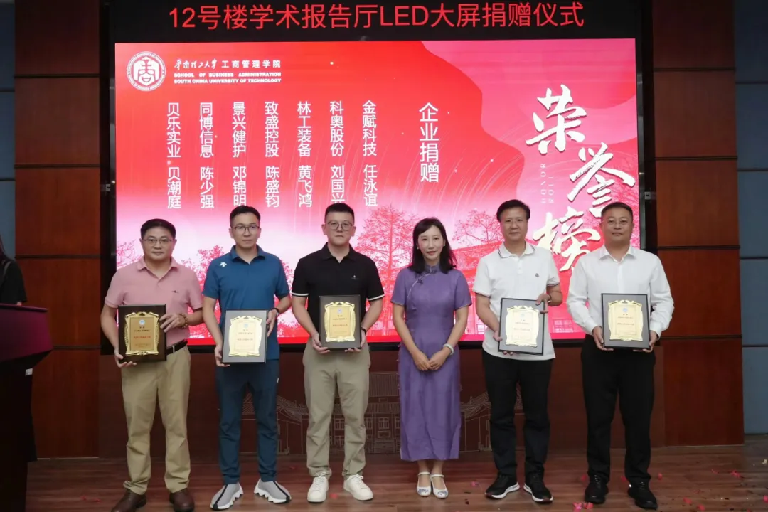 华工工管党委书记周勤(左四)为企业捐赠颁牌