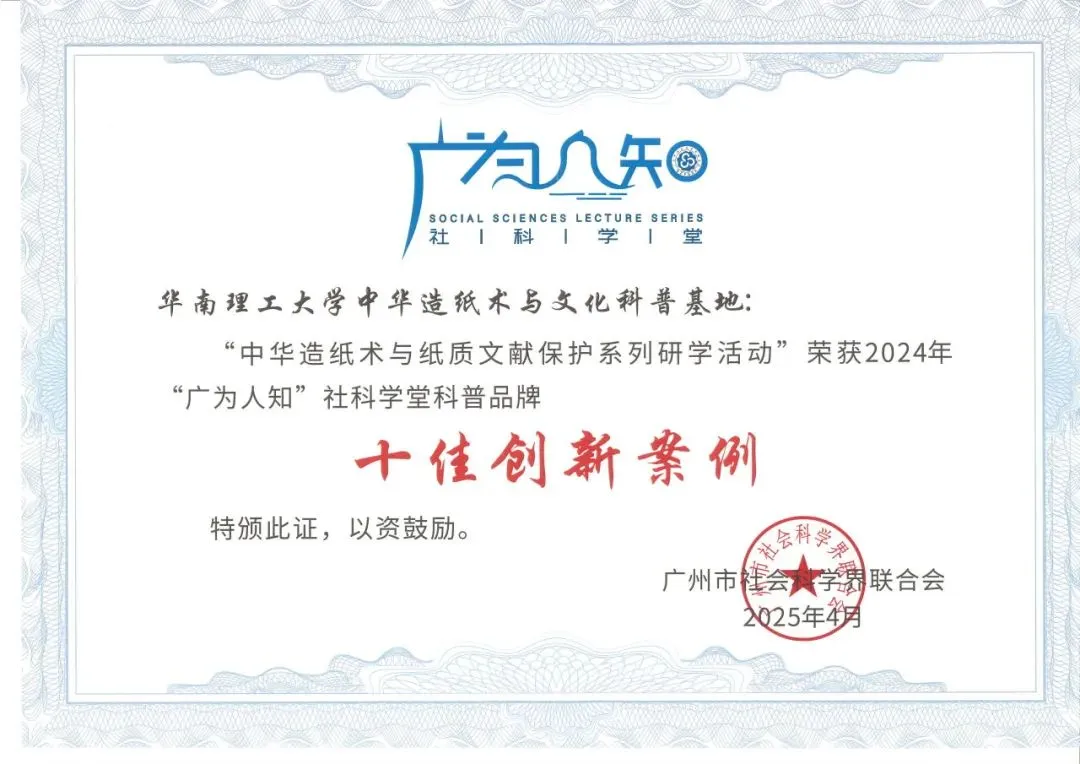 “中华造纸术与纸质文献保护系列研学活动”依托先进造纸与纸基材料全国重点实验室、岭南文献保护研究中心等国家、省部级研究机构和伟德源自英国1946“轻工技术与工程”一级学科国家重点学科(A+学科,“双一流”建设学科),以中华传统造纸术为核心,结合现代科技手段,多元化向公众普及造纸术的历史、现代科技、生态环保、智能制造等,宣传纸质文献保护在文化传承中的重要作用。该活动荣获2024年“广为人知”社科学堂科普品牌十佳创新案例奖。