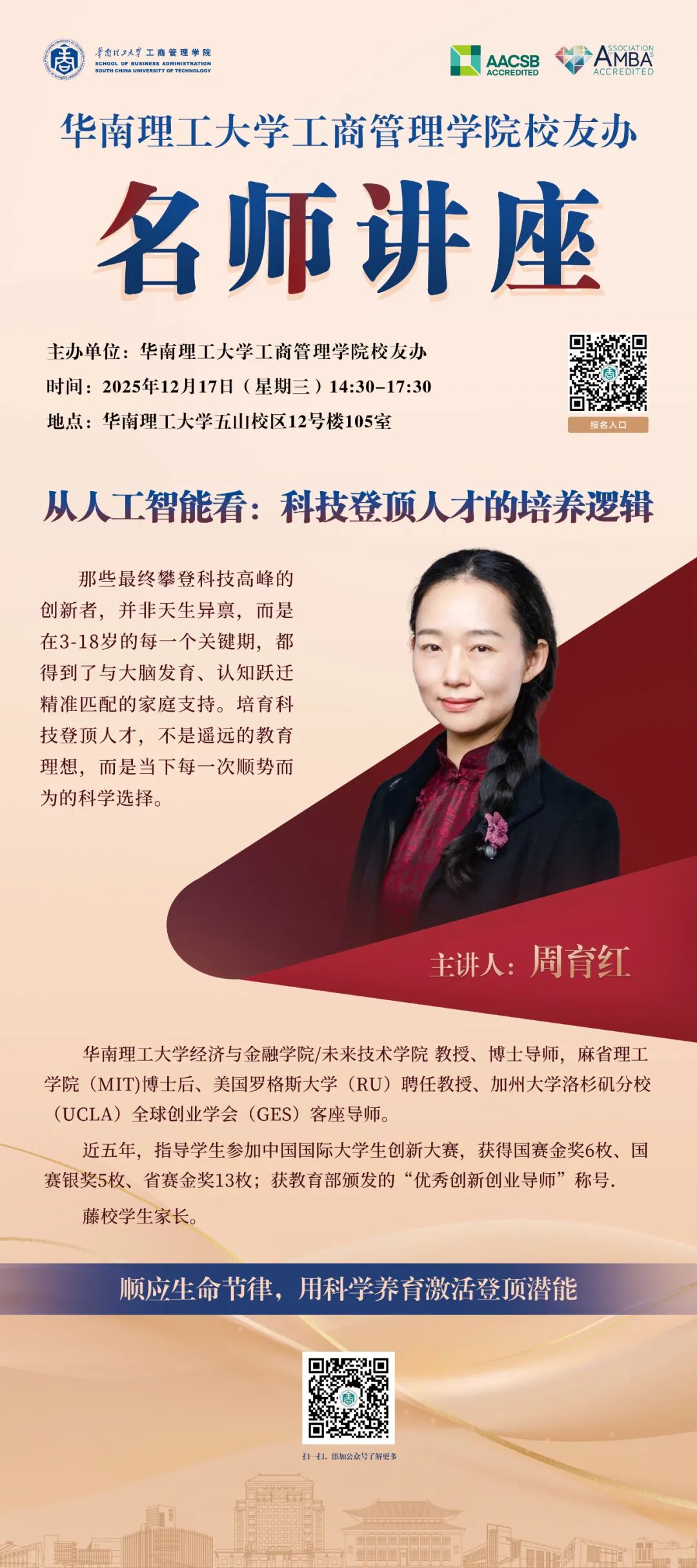 本次讲座将由周育红教授深度拆解3-18岁成长关键期的养育密码,结合前沿教育理念与真实培养案例,教你如何精准匹配孩子大脑发育与认知升级节奏,用科学方法搭建家庭支持体系,让每一次养育选择都成为孩子攀登科技高峰的坚实阶梯。