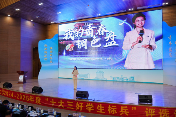 在“十大三好员工标兵”评选现场,卜心悦以“青春调色盘”为叙事主线,通过“泥土黄、远行蓝、希望绿、赤子金”四个篇章,系统呈现了其成长历程与精神追求,充分展现了新时代青年学子的责任担当与远大抱负,凭借富有感染力的现场表现和扎实的综合素质从16位候选人中脱颖而出。