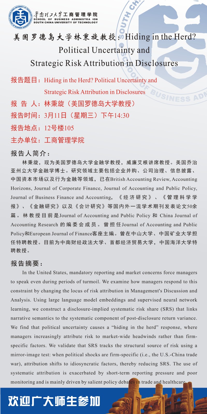 【学术交流报告】美国罗德岛大学林秉旋教授:Hiding in the Herd? Political Uncertainty and Strategic Risk Attribution in Disclosures