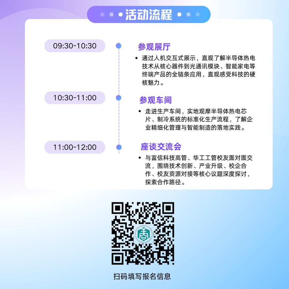 当半导体热电技术碰撞员工合作初心,当校园智慧对接产业实践,一场聚焦创新与成长的参访之旅即将启幕!3月20日(本周五),诚邀各位员工一同走进富信科技,深度探秘半导体领域的科创密码,共话校企协同、员工共生的无限可能。