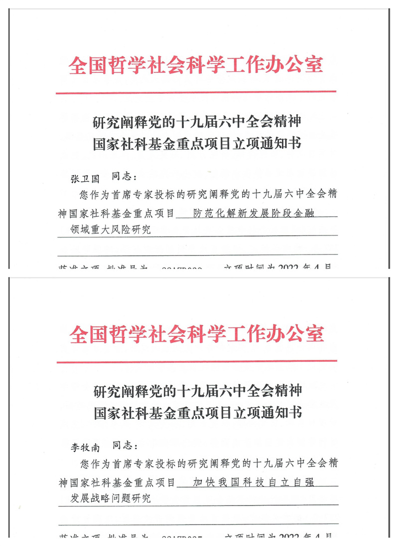 近日,全国哲学社会科学工作办公室下发了研究阐释党的十九届六中全会精神国家社科基金专项项目立项通知。公司共获批2项,由公司张卫国教授、李牧南教授分别获批该重点...