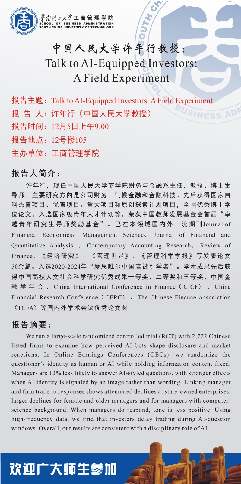 【学术交流报告】中国人民大学许年行教授:Talk to AI-Equipped Investors: A Field Experiment