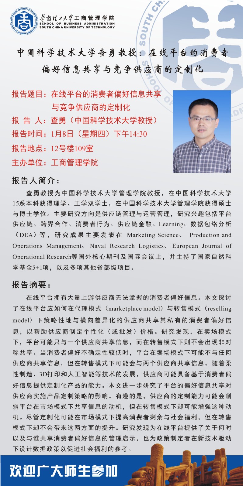 【学术交流报告】中国科学技术大学查勇教授:在线平台的消费者偏好信息共享与竞争供应商的定制化