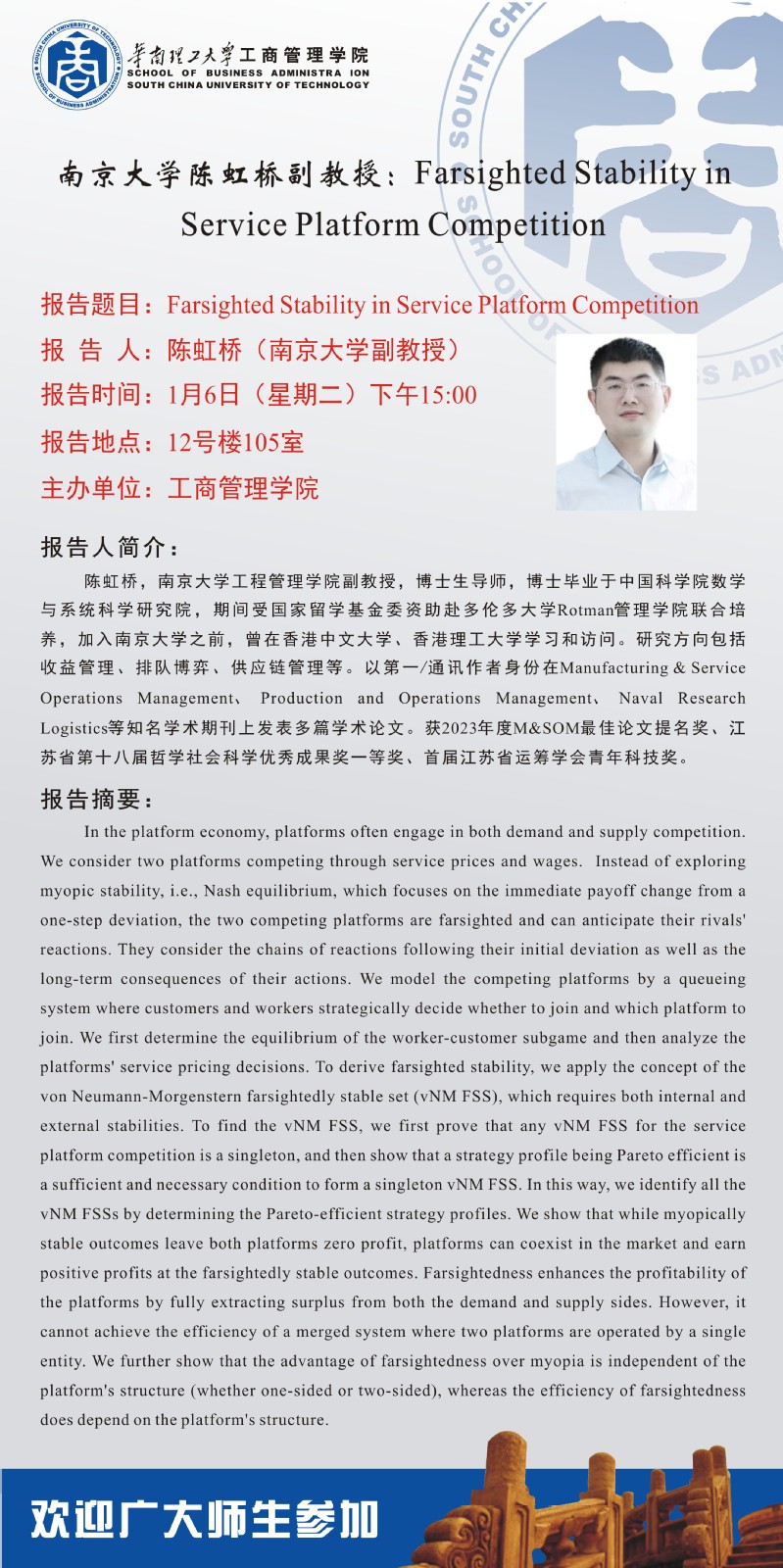 【学术交流报告】南京大学陈虹桥副教授:Farsighted Stability in Service Platform Competition