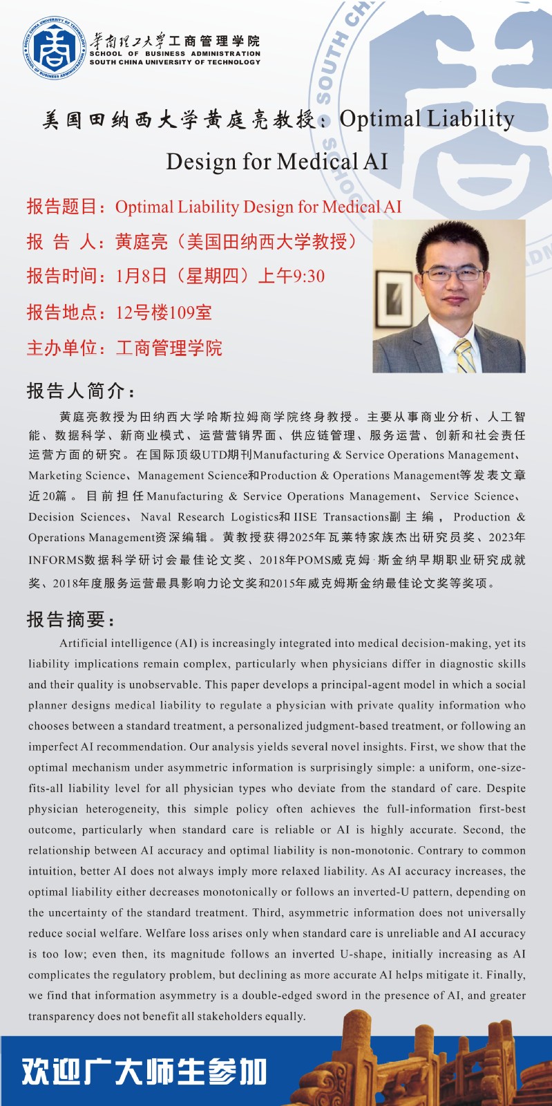 【学术交流报告】美国田纳西大学黄庭亮教授:Optimal Liability Design for Medical AI