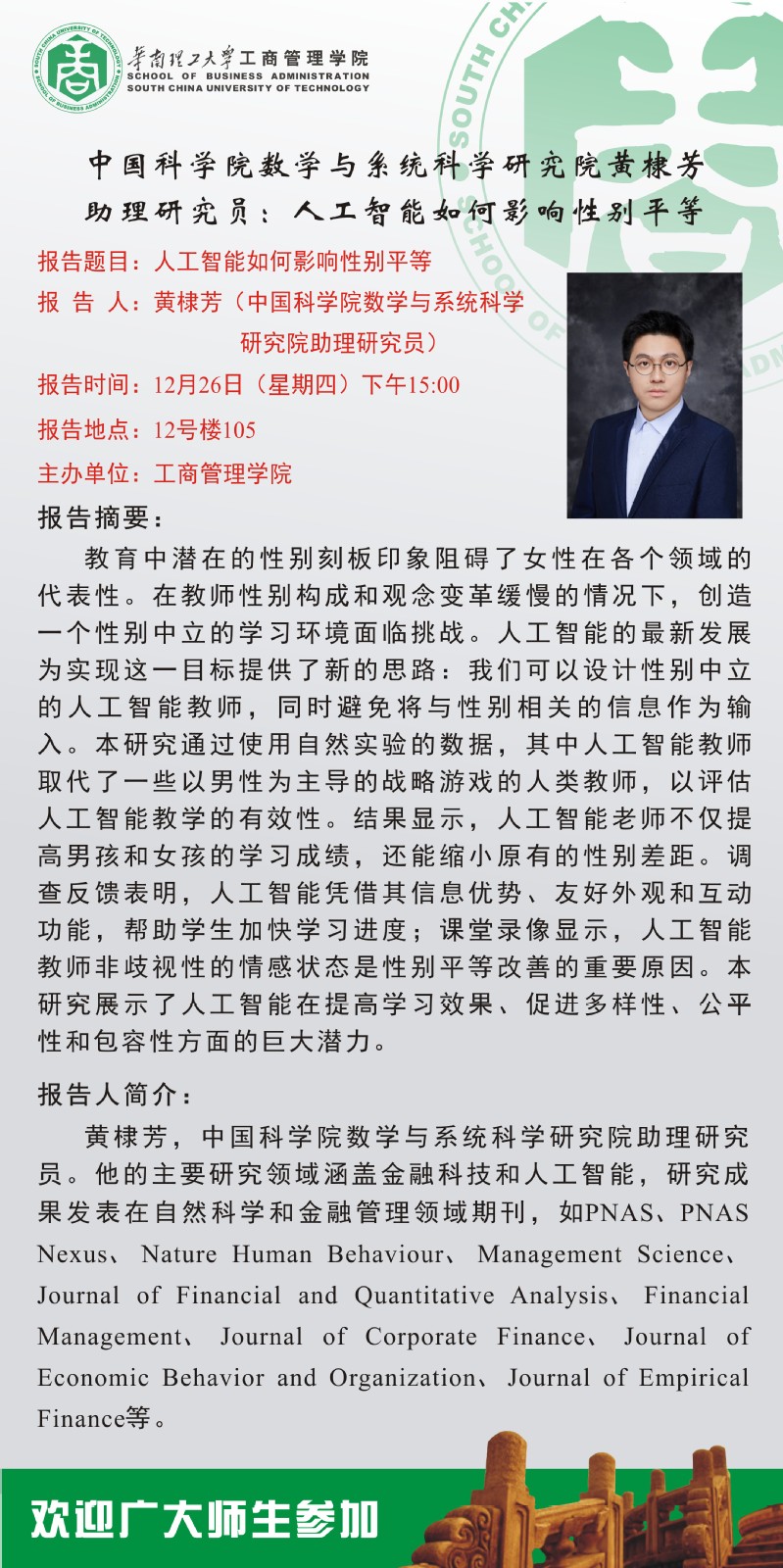 【学术交流报告】中国科公司数学与系统科学研究院黄棣芳助理研究员:人工智能如何影响性别平等