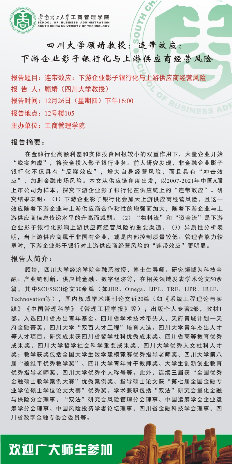 【学术交流报告】四川大学顾婧教授:连带效应:下游企业影子银行化与上游供应商经营风险
