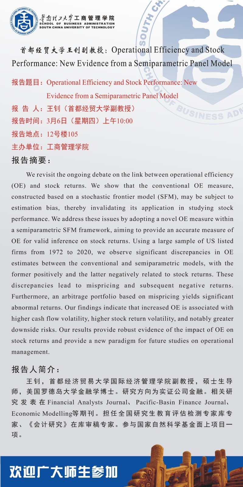【学术交流报告】首都经贸大学王钊副教授:Operational Efficiency and Stock Performance: New Evidence f...