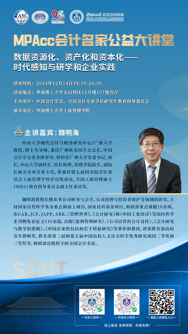 【讲座通知】MPAcc会计名家公益大讲堂:数据资源化、资产化和资本化—时代感知与研学和企业实践