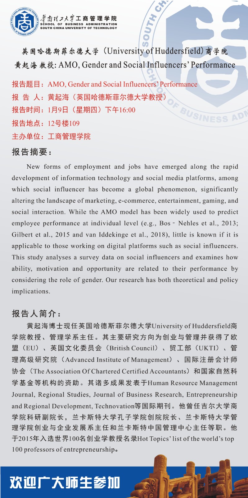 【学术交流报告】英国哈德斯菲尔德大学(University of Huddersfield)商公司黄起海教授: AMO, Gender and So...